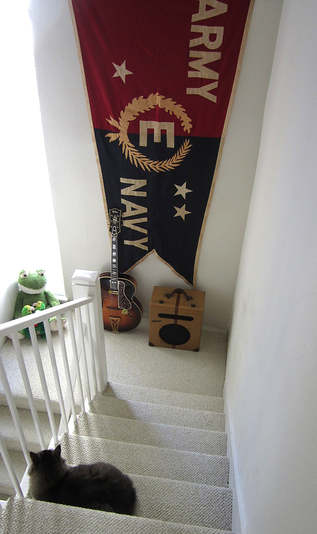 b. The pennant will be swallow tailed, will have a white border, and will have a white capital letter E within a yellow wreath of oak and laurel leaves on a vertical divided blue and red background.