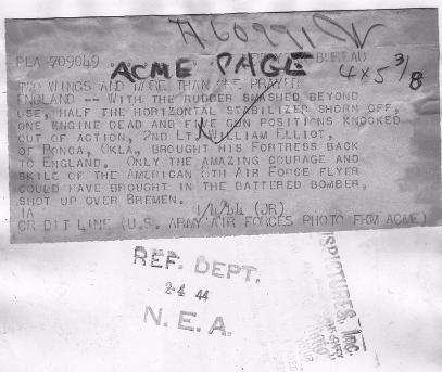 Original photo. WWII B-17 with damage. Ref. Dept. February 2, 1944.
