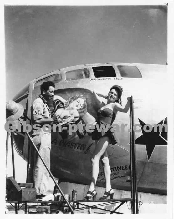 Original photo of a B-29 Super Fortress. This is a rare image of the artist capturing the model's look for this aircraft's 'nose art'. Something very common on bombers.